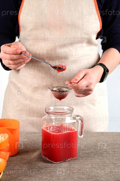 Женщина процеживает через сито свежевыжатый апельсиновый сок