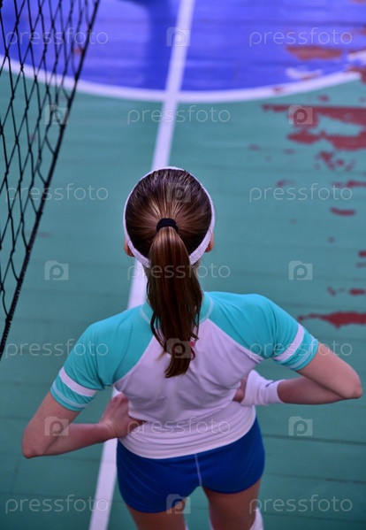 Девушка, игрок волейбольной команды, стоит на поле в ожидании свистка