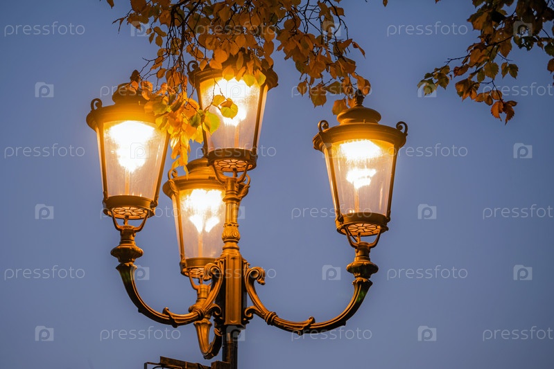 Светящийся старинный фонарь на фоне ночного неба и осенней листвы