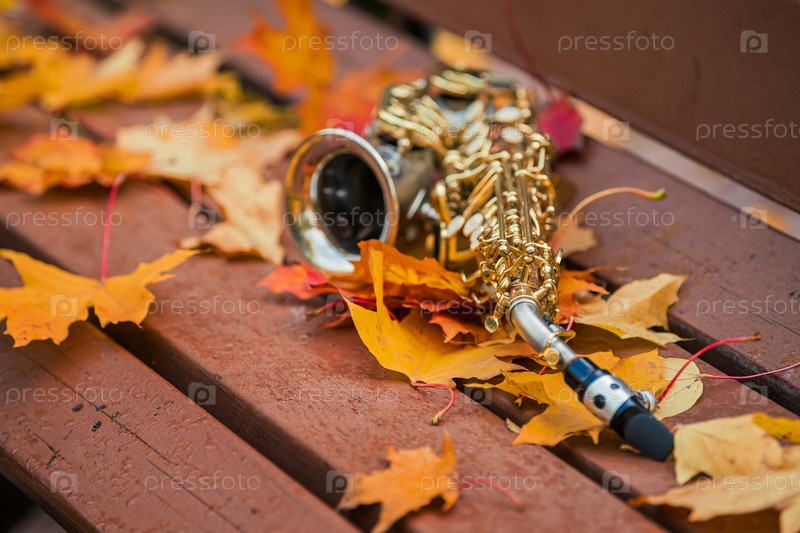 Осенняя музыка: золотой саксофон на скамейке в осеннем парке на фоне опавших оранжевых листьев