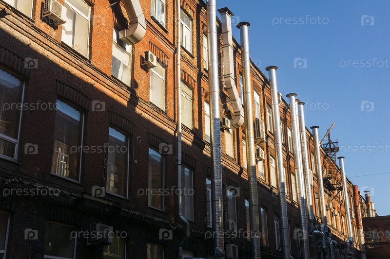 Промышленный архитектурный фон, трубопроводы на фасаде старинного здания фабрики