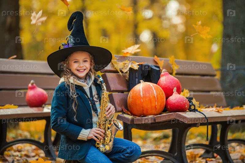 Веселая маленькая девочка играет на саксофоне в шляпе ведьмы в осеннем парке возле тыкв. Хэллоуин