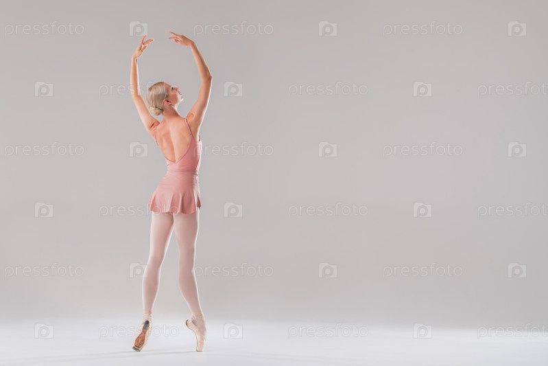 Балерина в розовом купальнике танцует на белом фоне