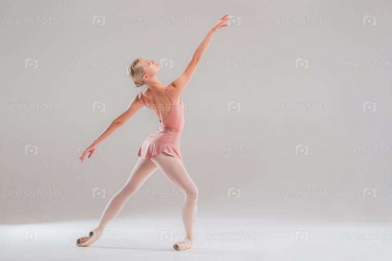 Профессиональная балерина в розовом купальнике танцует на белом фоне. Копировать пространство