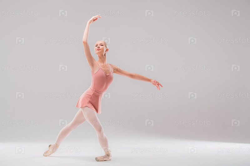Профессиональная балерина в розовом купальнике танцует на белом фоне. Копировать пространство