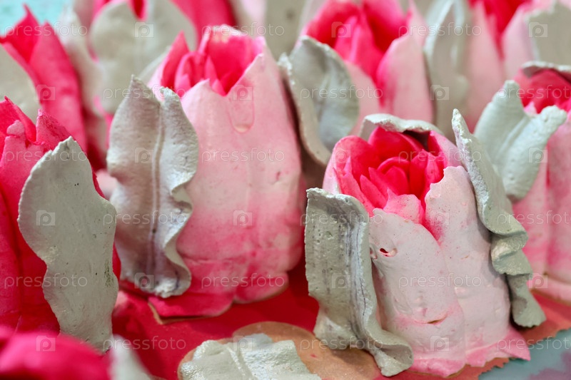 Ярко-розовые тюльпаны из зефира. Цветы из зефира. Разложены на поверхности стола