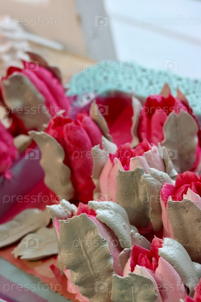 Ярко-розовые тюльпаны из зефира. Цветы из зефира. Разложены на поверхности стола