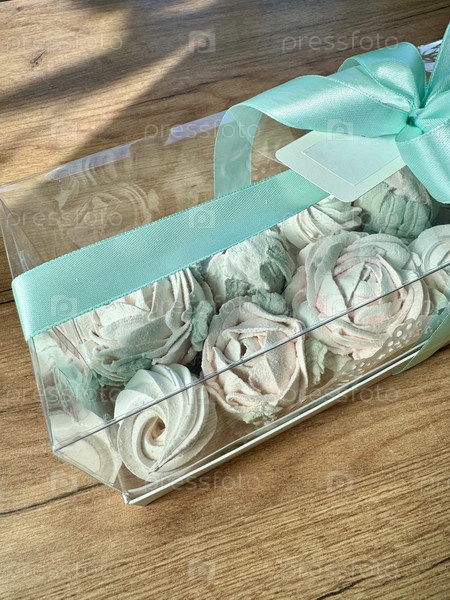 Цветы из маршмеллоу в подарочной коробке с прозрачной крышкой. Домашние маршмеллоу в подарок. Крупный план