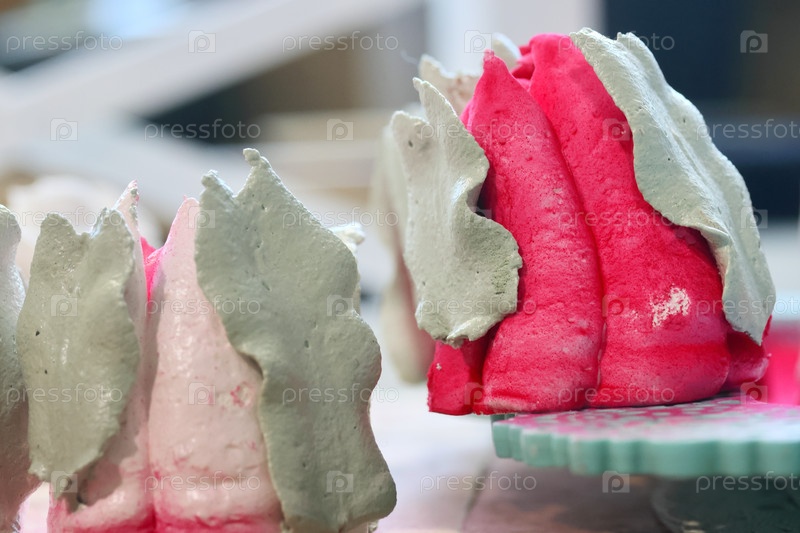 Ярко-розовые тюльпаны из зефира. Цветы из зефира. Разложены на поверхности стола