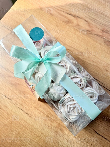 Цветы из маршмеллоу в подарочной коробке с прозрачной крышкой. Домашние маршмеллоу в подарок. Крупный план