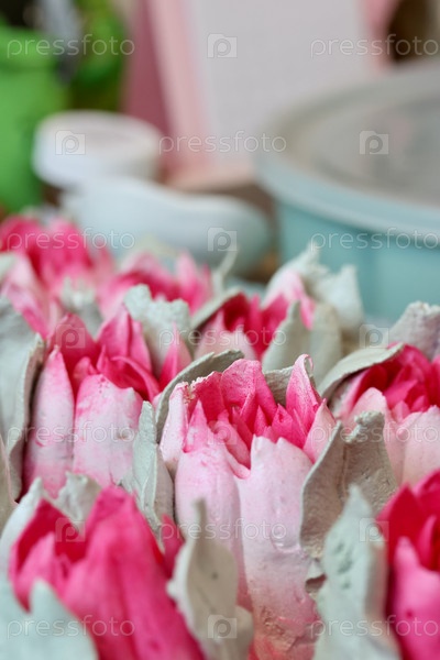 Ярко-розовые тюльпаны из зефира. Цветы из зефира. Разложены на поверхности стола