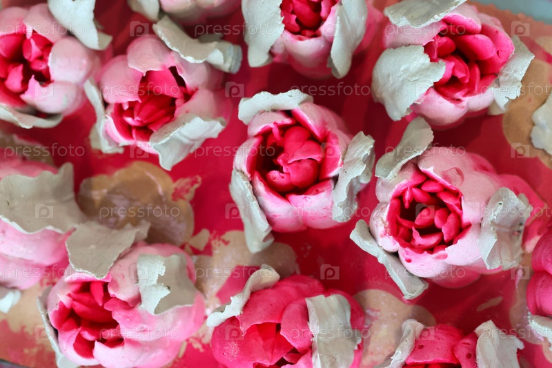 Ярко-розовые тюльпаны из зефира. Цветы из зефира. Разложены на поверхности стола