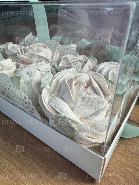 Цветы из маршмеллоу в подарочной коробке с прозрачной крышкой. Домашние маршмеллоу в подарок. Крупный план
