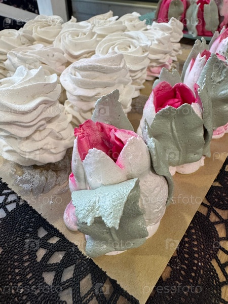 Домашние зефиры разложены на поверхности стола. Они застывают и стабилизируются перед упаковкой. Зефир классический. Тюльпаны из зефира