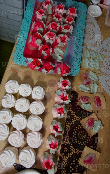 Домашние зефиры разложены на поверхности стола. Они застывают и стабилизируются перед упаковкой. Зефир классический. Тюльпаны из зефира