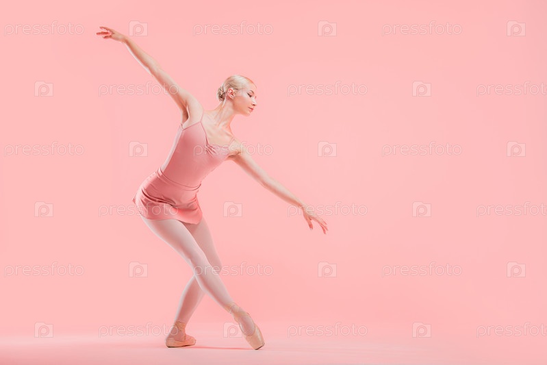 Балерина в розовом купальнике танцует на розовом фоне