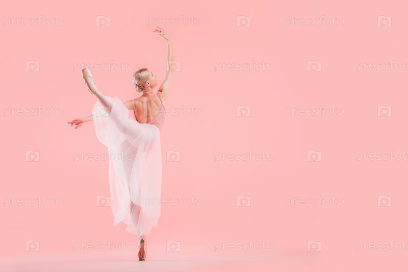 Балерина в розовом купальнике танцует на розовом фоне