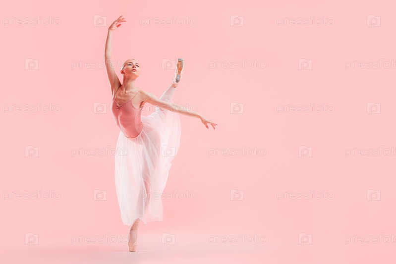 Балерина в розовом купальнике танцует на розовом фоне