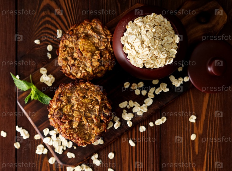 Домашнее овсяное печенье с бананом, овсом, орехами, яйцами и мукой без муки на коричневом темном деревянном столе, вид сверху