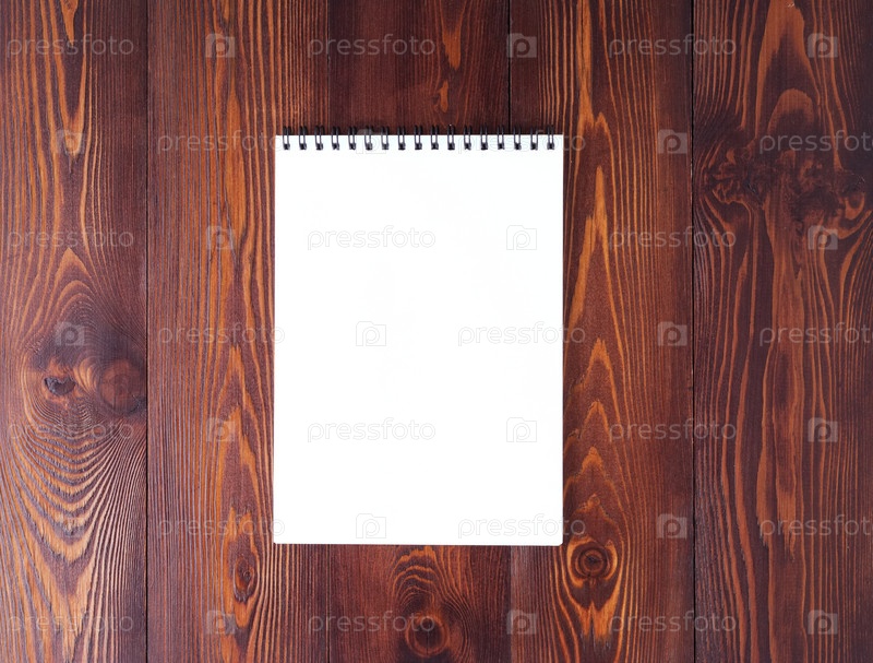 Открытый блокнот со спиралью на темно-коричневом деревянном столе, вид сверху