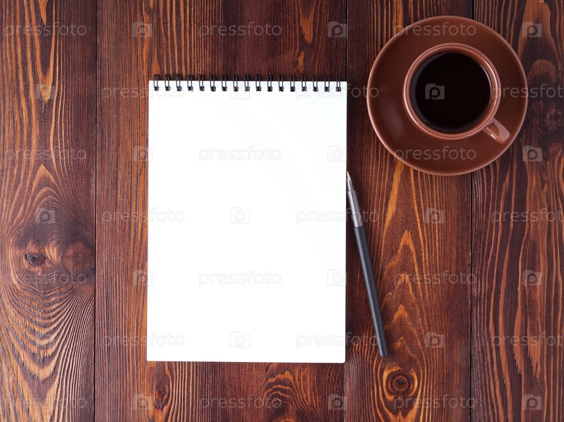Открытый блокнот со спиралью, ручкой и чашкой кофе на темно-коричневом деревянном столе, вид сверху