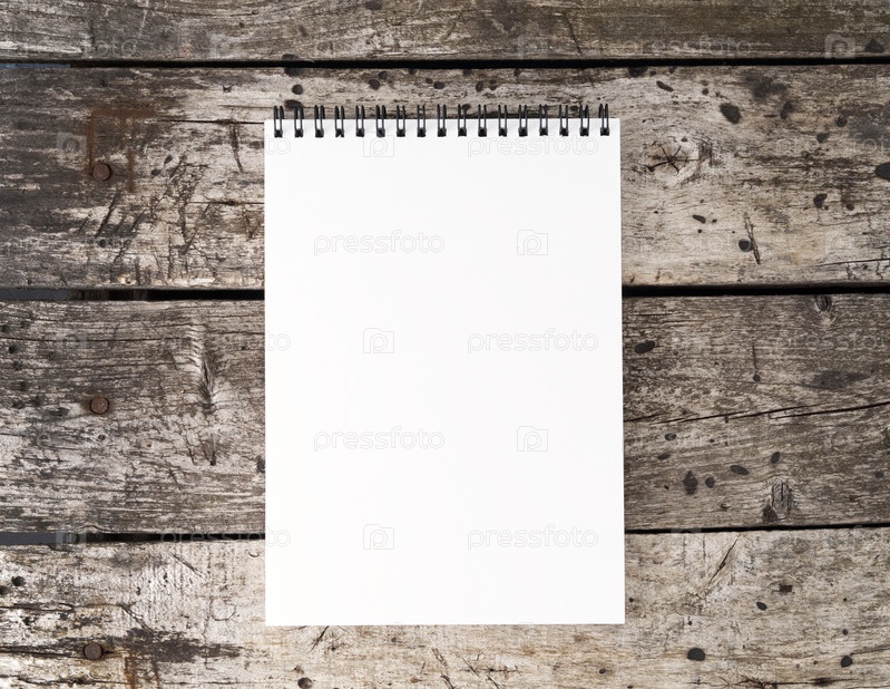 Открытый блокнот с чистой белой страницей на старом деревенском деревянном столе, вид сверху