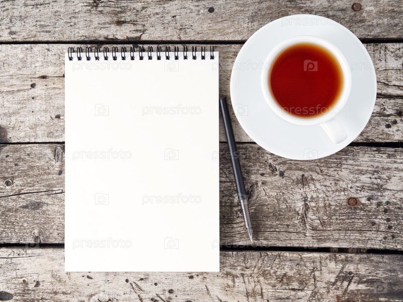 Открытый блокнот с чистой белой страницей, ручкой и чашкой кофе на старом деревенском деревянном столе, вид сверху