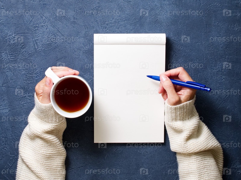 Женщина пишет в блокноте на темно-синем столе, рука в рубашке держит карандаш, чашка чая, рисунок в альбоме