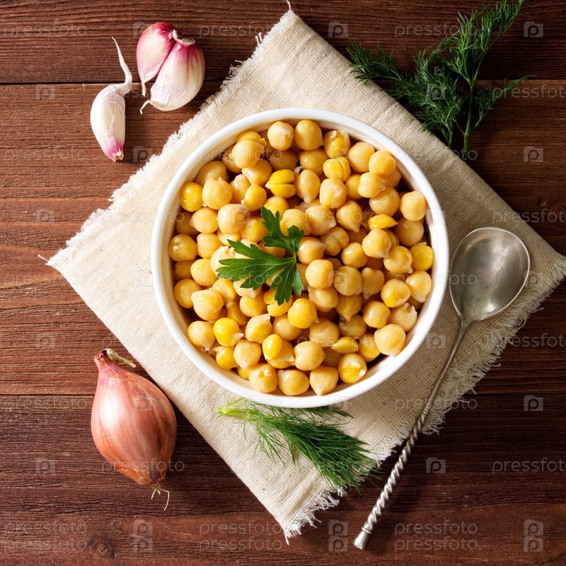Приготовленный нут в миске на темном деревянном столе. Здоровая, вегетарианская питательная белковая еда Ближнего Востока. Вид сверху