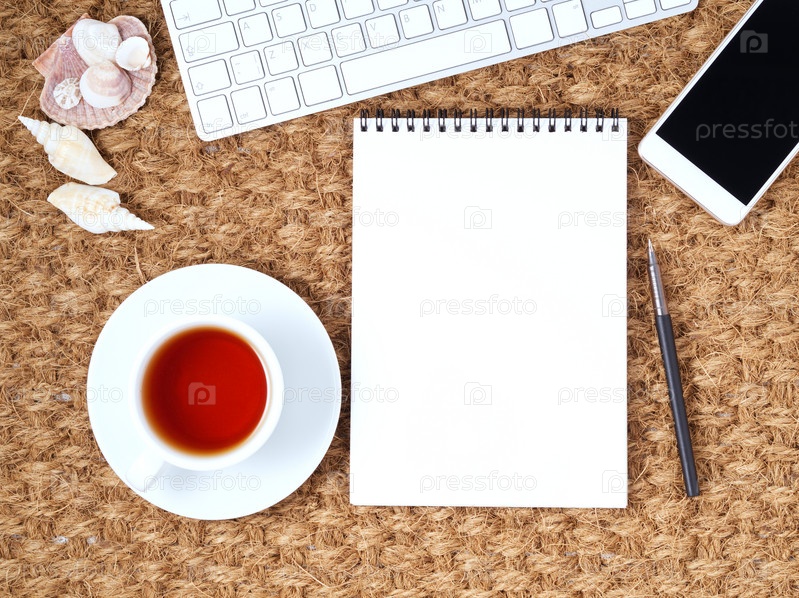 Рабочее место с ноутбуком и пустым блокнотом на коврике. Вид сверху. Плоская планировка. Рабочий стол фрилансера, теплый климат