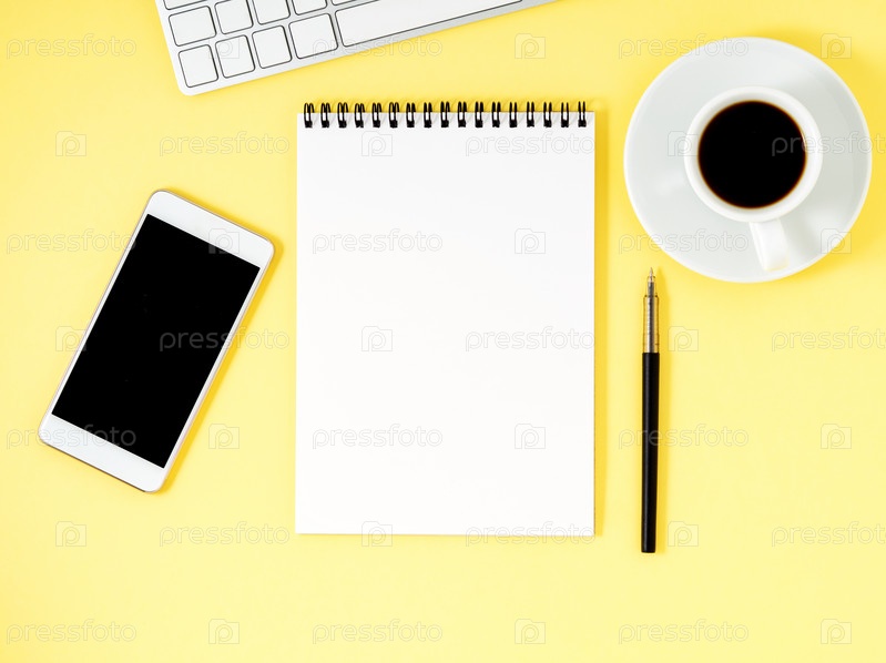 Вид сверху на желтый офисный стол с блокнотом, клавиатурой компьютера, смартфоном. Макет, пустое пространство