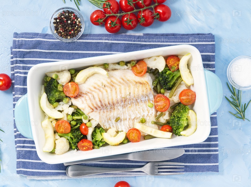 Рыба треска запеченная в синей духовке с овощами - брокколи, помидорами. Здоровое и диетическое питание. Синий каменный фон, вид сверху