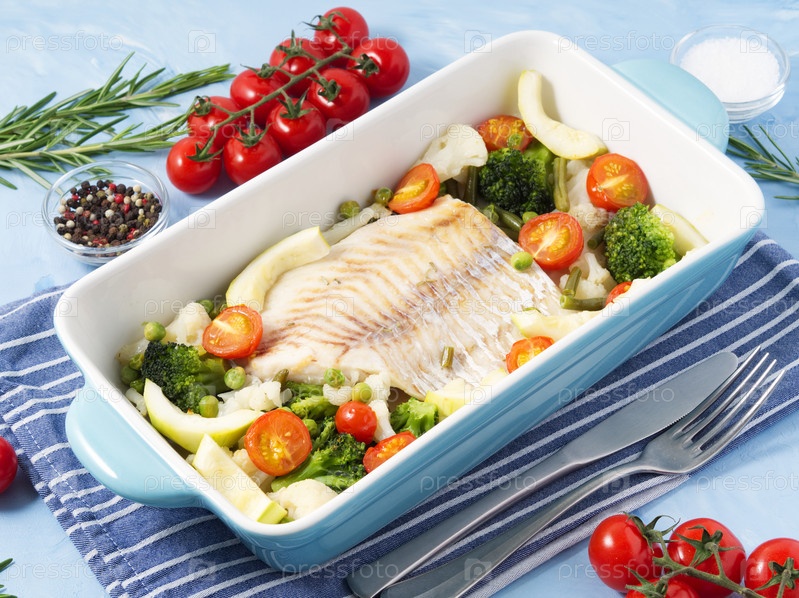 Рыба треска запеченная в синей духовке с овощами - брокколи, помидорами. Здоровое диетическое питание. Синий каменный фон, вид сбоку