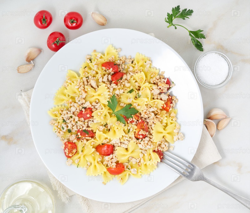 Паста фарфалле с помидорами, куриным мясом, петрушкой на белом каменном фоне, низкокалорийная диета, вид сверху