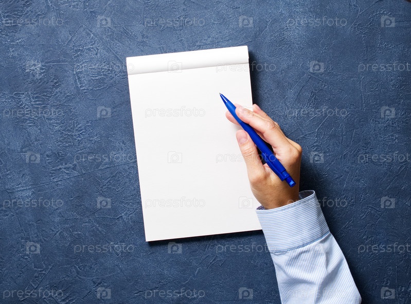 Женщина пишет в блокноте на темно-синем столе, рука в рубашке держит карандаш, рисунок в альбоме, вид сверху