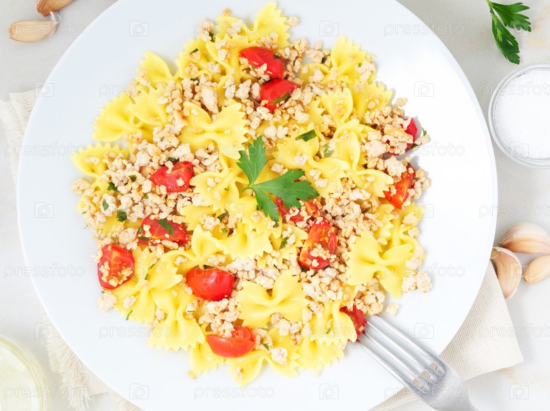 Паста фарфалле с помидорами, куриным мясом, петрушкой на белом каменном фоне, низкокалорийная диета, вид сверху