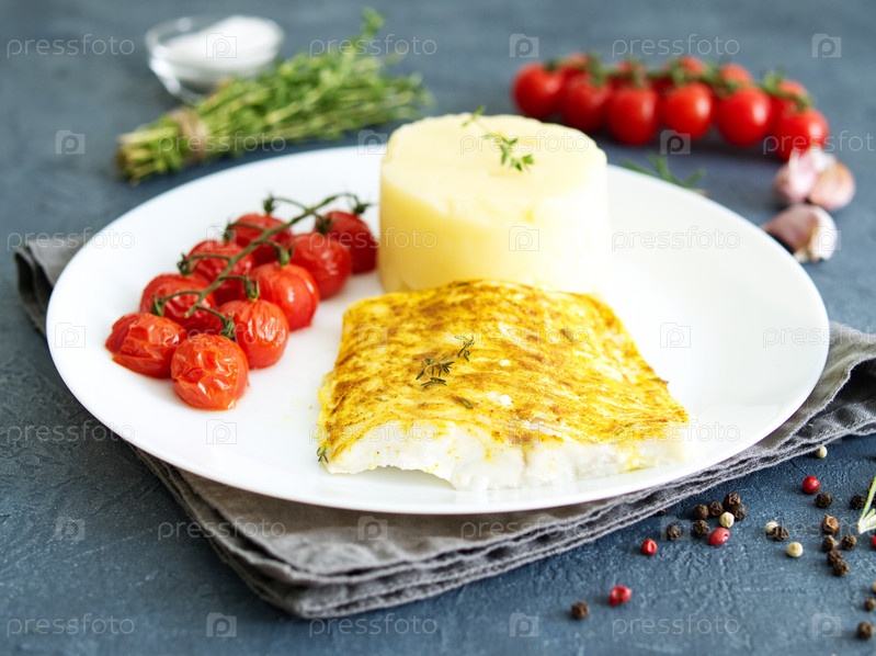 Рыба треска запеченная в духовке с картофельным пюре, помидорами, диетическое здоровое питание. Темно-серый фон, вид сбоку