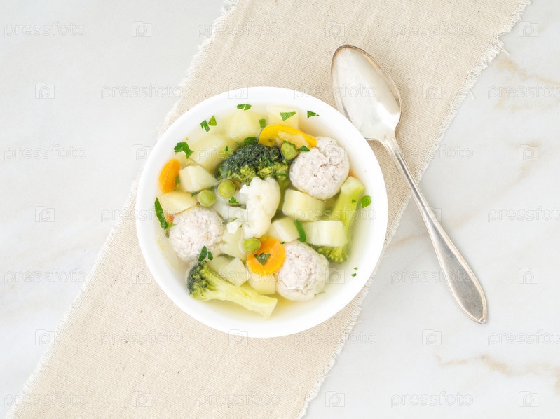 Тарелка супа, чашка бульона и овощей, фрикадельки из индейки и курицы, вид сверху