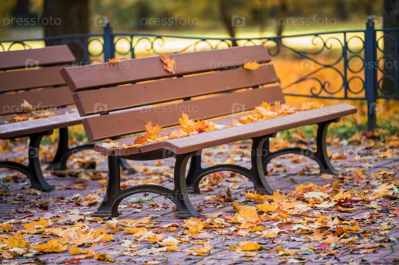 Пустая скамейка в парке, покрытая опавшими листьями, в тихий осенний день