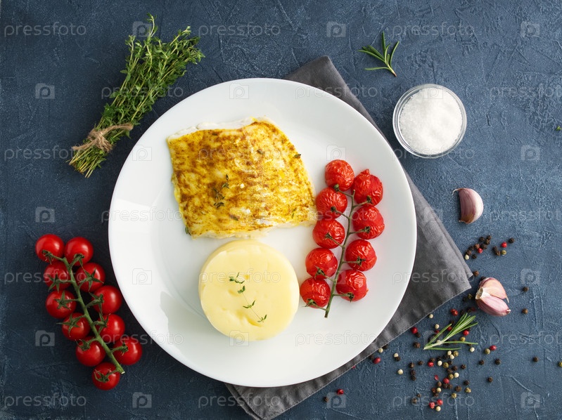 Рыба треска запеченная в духовке с картофельным пюре, помидорами, диетическое здоровое питание. Темно-серый фон