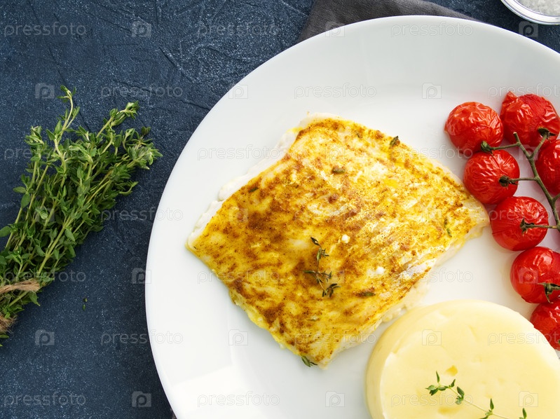 Рыба треска запеченная в духовке с картофельным пюре, помидорами, диетическое здоровое питание. Темно-серый фон, вид сверху
