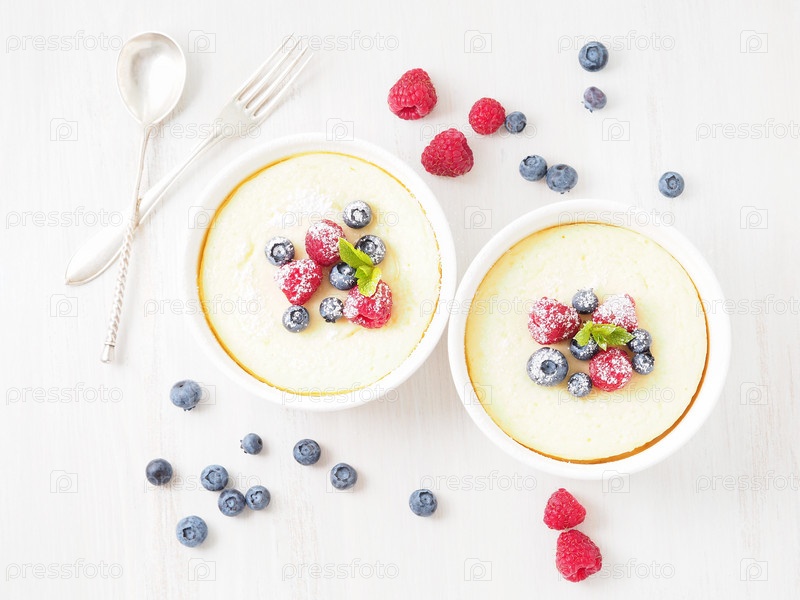 Чизкейк, украшенный малиной, черникой и мятой в двух формочках, восхитительный десерт на завтрак, вид сверху