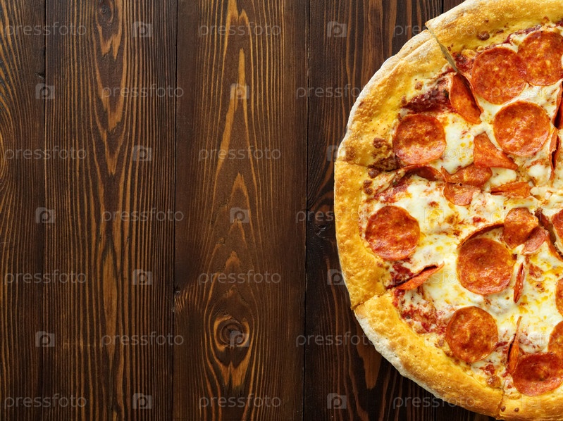 Часть пиццы пепперони, томатный соус, дополнительная порция сыра моцарелла, вид сверху с местом для текста