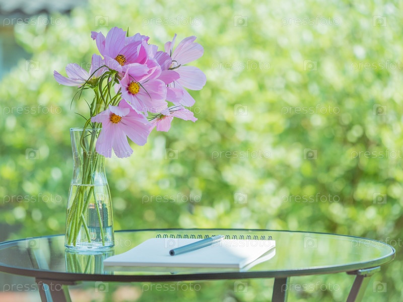 Блокнот и ручка на столе в парке, сад на природе, букет нежных цветов, пустое пространство. Концепция для размышлений, мечтаний, написания текста