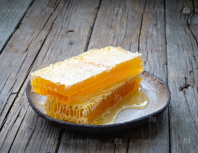 Мед в сотах, крупный план, на белой керамической тарелке, на деревянном деревенском столе,