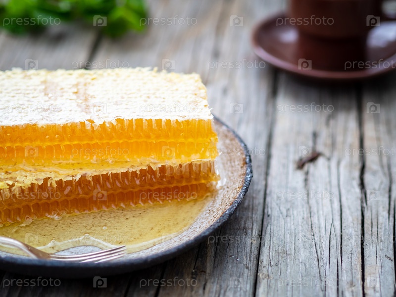 Мед в сотах, крупный план, на керамической тарелке, на деревянном деревенском столе, вид сбоку