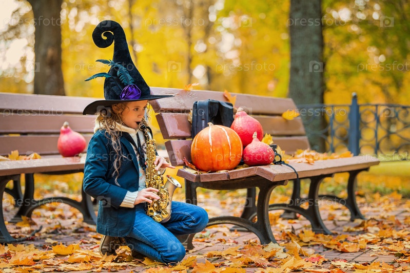 Веселая маленькая девочка играет на саксофоне в шляпе ведьмы в осеннем парке возле тыкв. Хэллоуин