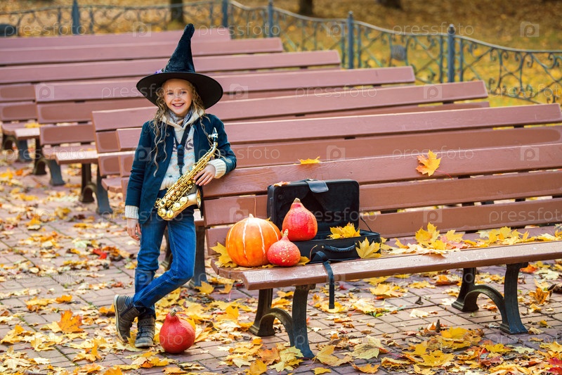 Веселая маленькая девочка играет на саксофоне в шляпе ведьмы в осеннем парке возле тыкв. Хэллоуин