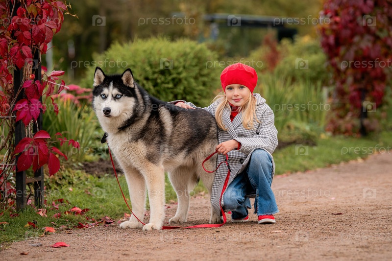 Маленькая девочка в красном берете и пальто гуляет с собакой породы хаски на поводке по тропинке в осеннем парке