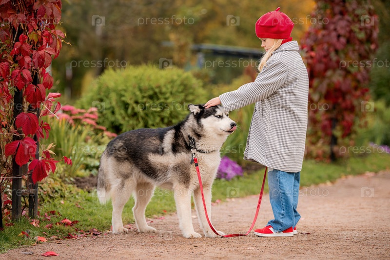 Маленькая девочка в красном берете и пальто гуляет с собакой породы хаски на поводке в осеннем парке
